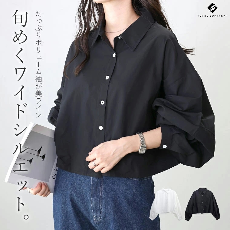 【本日限定】ボリュームスリーブコットンシャツブラウス シャツ ブラウス 羽織り レギュラーカラー ボリューム袖 大人 長袖 ジャスト丈 秋 冬 30代 40代 レディース