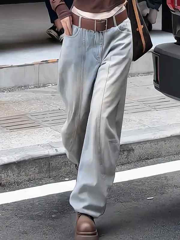 ハイウエスト ウォッシュ ストレート ワイド レッグ ジーンズ スリム パンツ