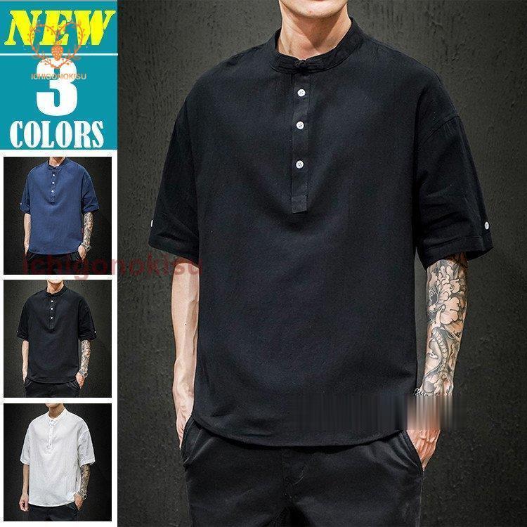 【大好評】無地Tシャツ メンズ Tシャツ 半袖 リネン 綿麻Tシャツ 中華 カジュアル トップス 夏 お兄系